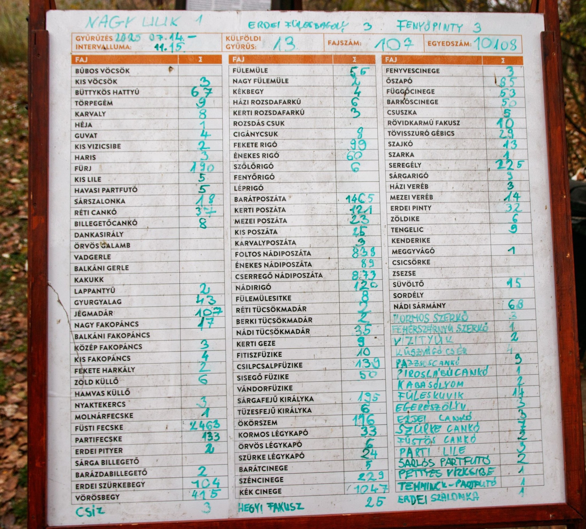 Az eddigi nyári, őszi működés 102 napja alatt 100 madárfaj, 8876 egyedére került jelölő gyűrű. 12 külföldi jelölésű madarat fogtunk vissza.