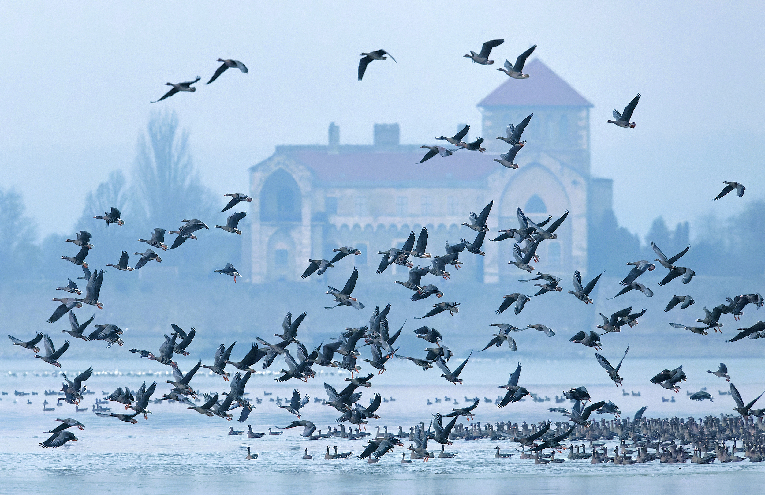 A zavarás miatt az addig nyugodt vízimadártömeg felriadt és hosszú percekig kavarogtak a tó fölött, illetve több csapat el is repült.